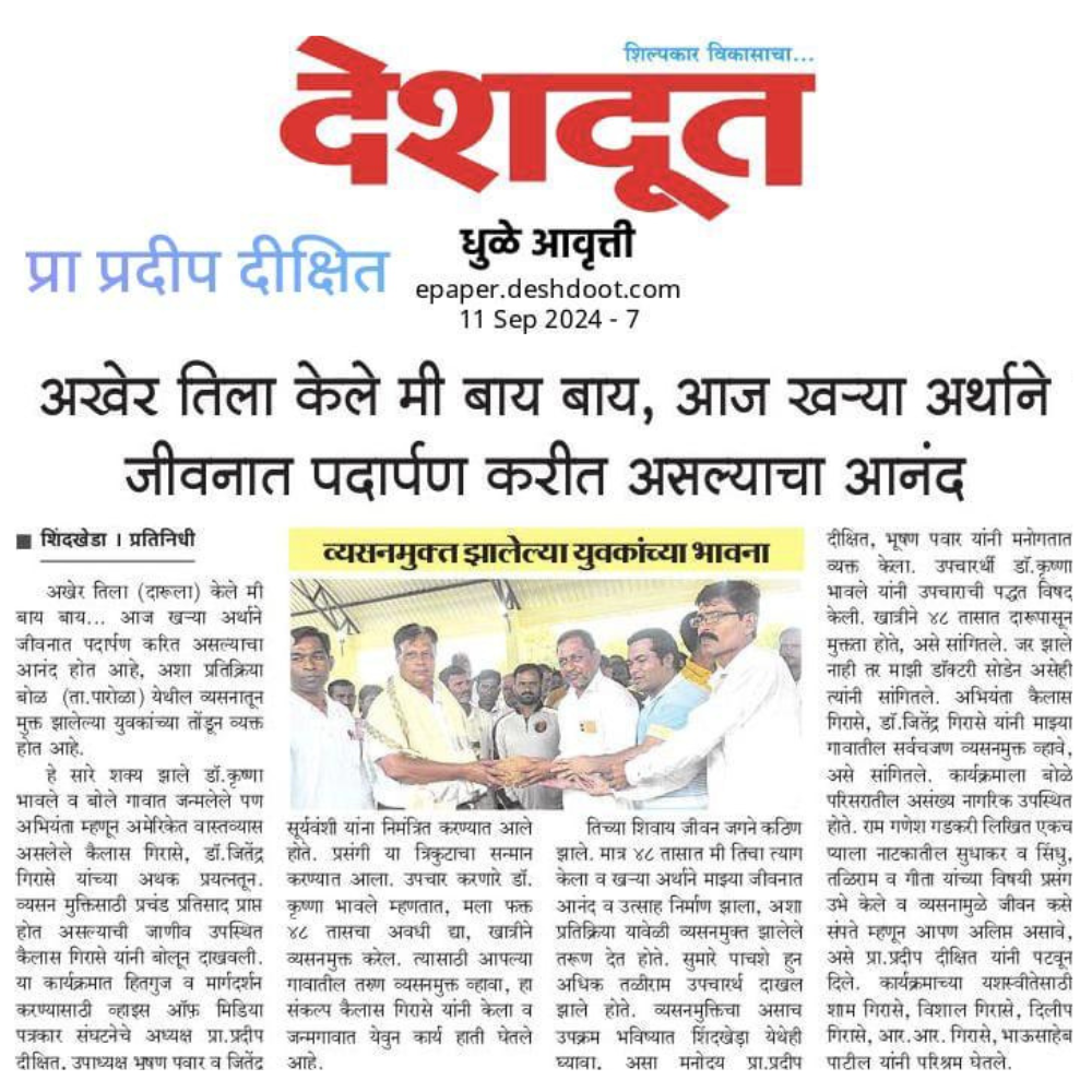 मी दारूच्या व्यसनात पूर्णपणे गुरफटून गेलो होतो. डॉ. कृष्णा भावले यांच्या मार्गदर्शनामुळे आणि मोफत उपचारांमुळे आज मी पूर्णपणे व्यसनमुक्त आहे. आता मी कुटुंबासोबत आनंदी जीवन जगत आहे